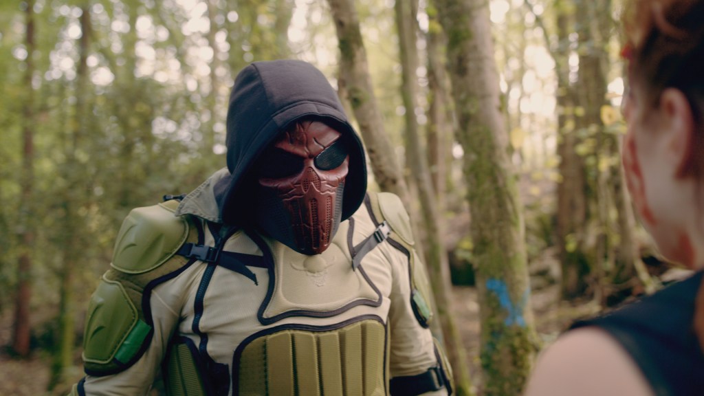 However, the reason to see this film of course are the kills as this is a horror film after all. Sporting a sick red and black mask with green padded armor, Ian Virgo as the killer looks like a cross between Red Hood from the Batman comics with Bane-like padding. The kills are quite interesting to see. From an explosion to one victim stabbed with a “for sale” sign (seriously!), it becomes a mystery as to their identity and the reason why make remind viewers of a certain 80s cult classic that take a similar approach involving the core plot.