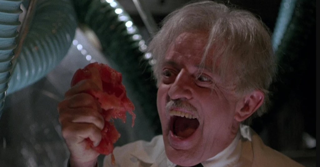 The cast includes David Koechner, Daniel Roebuck, Eric Roberts, Paul Bates, Catherine Corcoran, and the triumphant return of John Astin as Professor Mortimer Gangreen, a role he started in the first sequel, Return of the Killer Tomatoes, in 1988. This was followed by 1991’s Killer Tomatoes Strike Back and 1992’s Killer Tomatoes Eat France!